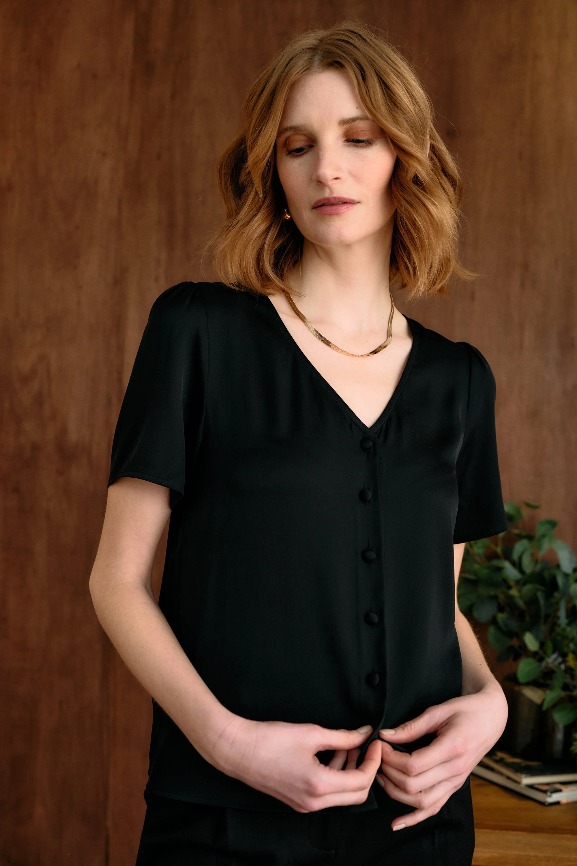 - Washable silk, button front blouse