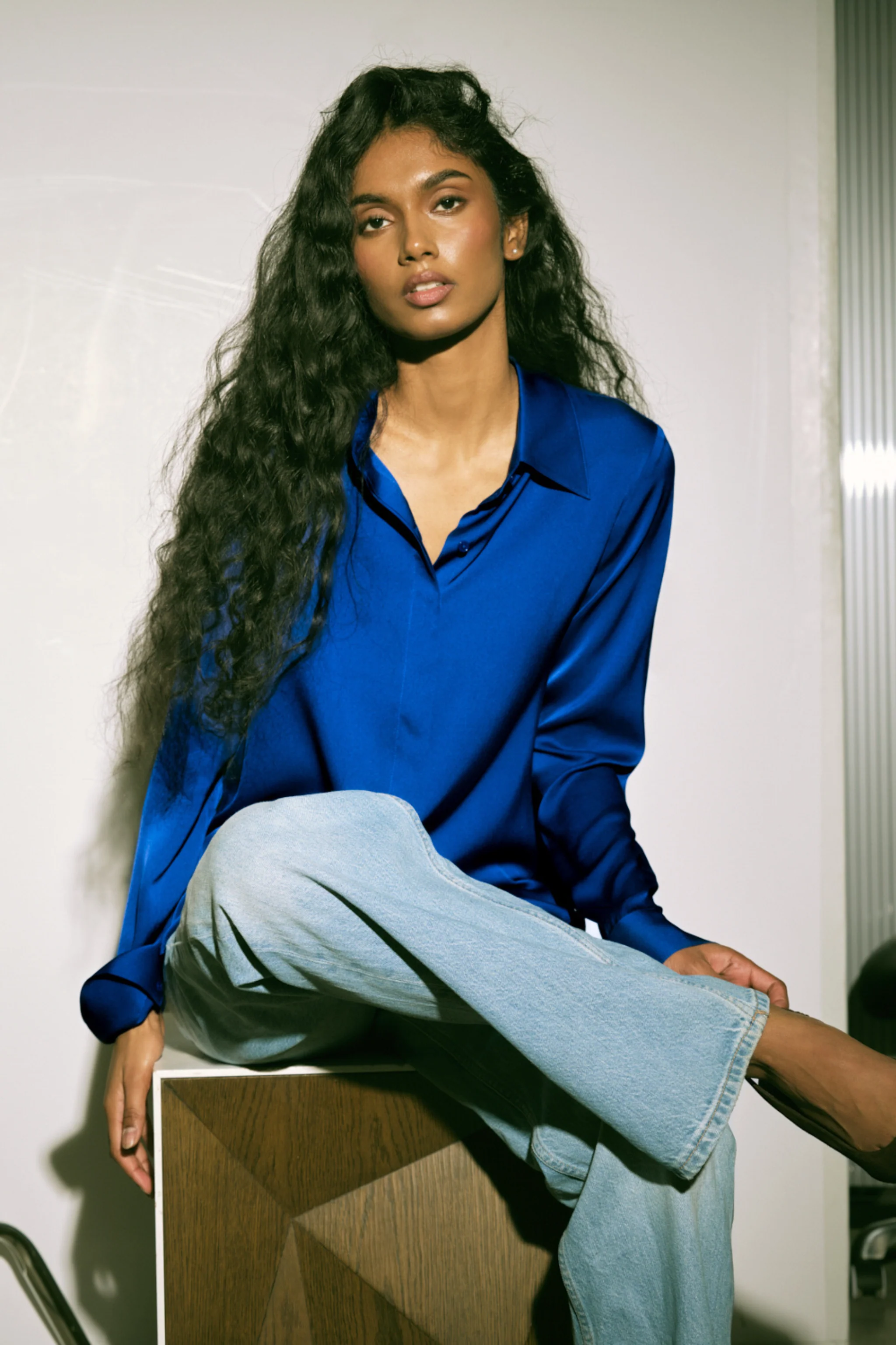 The Grace Silk Long Sleeve Blouse Cobalt Blue